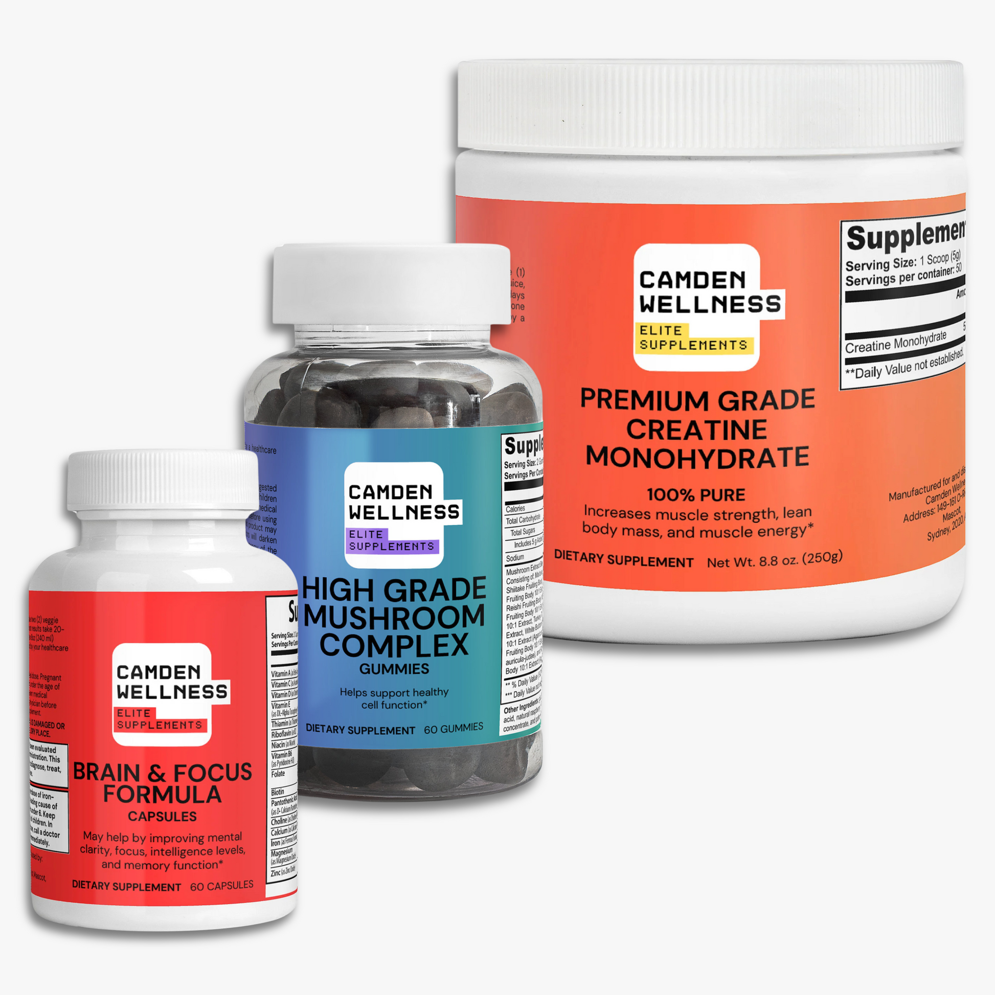 This bundle combines three of Camden Wellness’ most advanced formulas — Mushroom Extract Complex Gummies, Brain Focus Formula Capsules, and Premium Creatine Monohydrate Powder — to help you perform at your best. It’s designed for individuals who want sharper focus, sustained energy, and the physical drive to execute consistently.