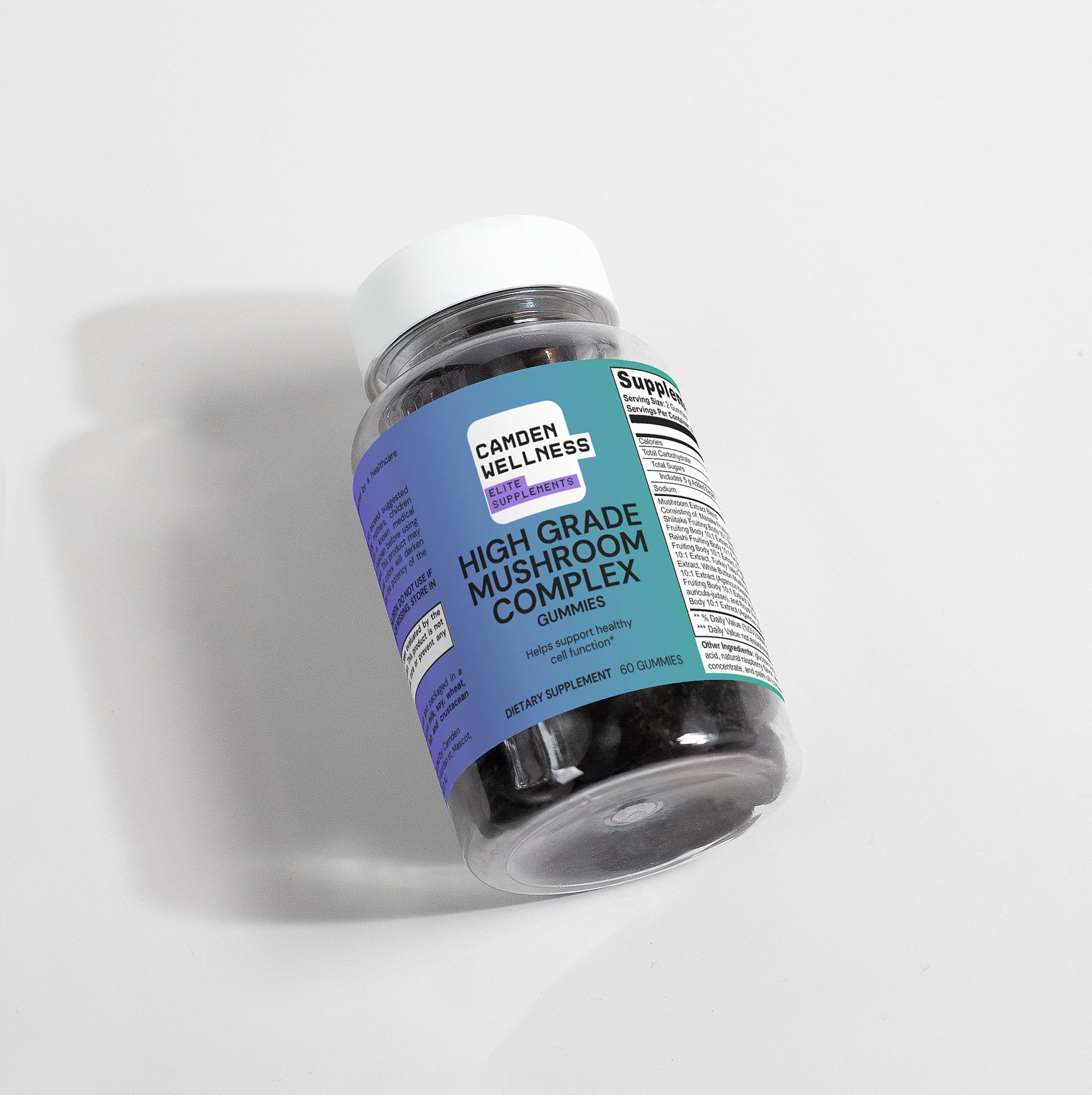 Ingredients: Mushroom extract (Maitake Fruiting Body 10:1 Extract, Shiitake Fruiting Body 10: 1 Extract, Lion’s Mane Fruiting Body 10:1 Extract, Reishi Fruiting Body 10:1 Extract, Cordyceps Fruiting Body 10:1 Extract, Chaga Fruiting Body 10:1 Extract, Turkey Tails Fruiting Body 10:1 Extract, White Button Mushroom Fruiting Body 10:1 Extract, Black Fungus Fruiting Body 10:1 Extract, Royal Sun Mushroom Fruiting Body 10:1 Extract), glucose syrup, sugar, dextrose, pectin, citric acid, natural raspberry flavor, sodium citrate, purple carrot juice concentrate, palm oil (contains carnauba wax).