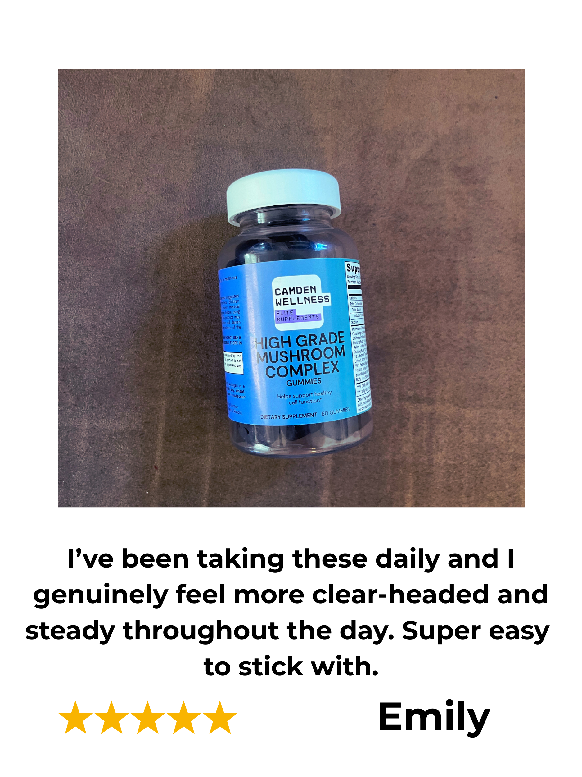 Mushroom Extract Complex Gummies combine ten popular mushroom varieties: Maitake, Shiitake, Lion's Mane, Reishi, Cordyceps, Chaga, Turkey Tail, White Button Mushroom, Black Fungus, and Royal Sun Mushrooms.